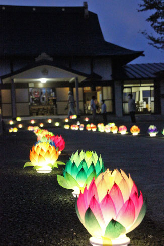 墓参りでにぎわうお盆の14日、大崎市古川沢田にある遍照院の参道に、薄い紙でハスの花をかたどったランタン100個が並べられた。日が落ちて辺りが暗くなるほどに美しさを増し、訪れた住民たちは一夜限りのライトアップを楽しんでいた。同寺院の護持会長、斎藤善清さん(75)が古川長岡地区公民館で開かれたランタン作り教室に参加し、美しさに魅了されたのがきっかけ。護持会の女性たちに協力を呼び掛け、同館職員2人も加わり、先月末から急いで100個を完成させた。この日は夕方から関係者が集まり、ランタンの色と設置する間隔のバランスを考えながら、参道の両脇に配置。前日のリハーサルを踏まえ、風に飛ばされないよう補強する工夫も施した。初の試みに、住民たちは「きれいだね」「お盆らしくてすてき」などと言いながら、スマートフォンで写真や動画を撮影していた。