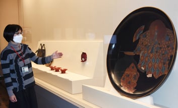 「japan/漆の表現展」が6日から、大崎市民ギャラリー・緒絶の館で開かれている。市を代表する工芸の一つ「鳴子漆器」はじめ、古民具、最新技術を用いた漆作品などが並び、漆の奥深い魅力を伝えている。17日まで。同ギャラリーの自主企画展。螺鈿の細工が施された昭和30年代の嫁鞍や角樽といった古民具、多彩な作家が制作した椀や箸、酒器、丸盆といった日用品など約120点を展示した。このうち、鳴子温泉神社の宝物「猩々の大盃」は、直径1・2メートル、高さ25センチの杯。墨流しのような模様「龍文塗」を考案した旧鳴子町出身の沢口悟一さん(1882~1962年)が8年かけて制作したもので、黒塗りの中に、能の演目「猩々」の一場面が描かれている。1908(明治41)年に完成したものだが、色あせない漆の美と迫力がひときわ目を引いている。