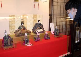 桃の節句を前に、300年前のひな人形を紹介した企画展が大崎市岩出山の史跡・名勝、旧有備館および庭園で開かれている。細密な造形ときらびやかな装飾や衣服が来館者の目を引いている。3月31日まで。ひな人形は、岩出山伊達家家臣の中嶋家が所蔵する「享保びな」で、能面のような白い面長の顔に切れ長の目、少し開いた口が特徴。男びな、女びな、五人ばやしのうち3体、右大臣、左大臣の計7体が現存。男びなの冠や女びなの扇は失われているものの本体はほぼ無傷で、衣装の発色も鮮やかに保たれている。