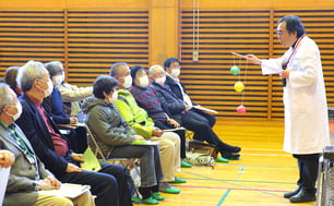 科学実験を通して防災について学んでもらう「防災エンスショー」が18日、美里町中埣コミュニティセンターで開かれた。東日本大震災から間もなく13年となり、記憶の継承が課題になりつつある中、住民約60人が日頃の備えを改めて考えた。同町本小牛田、青生、中埣3地区のコミュニティセンターが各地区の住民を対象に合同で実施。サイエンスインストラクターとして全国で公演している阿部清人さん(60)=仙台市=を講師に招いた。阿部さんは「日本の面積は世界の0・28%にすぎないが、地球をつくる十数枚の『プレート』と呼ばれる皿のうち4枚がひしめき合っていて、常に動いている。そのためマグニチュード6以上の地震5回のうち1回は日本で起きている」と述べた。