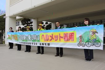 大崎市の古川地区交通安全協会長岡支部は4日、自転車乗車時のヘルメット着用を呼び掛ける横断幕を古川北小に贈った。昨年4月に改正道路交通法が施行され、自転車に乗る全ての人のヘルメット着用が努力義務化された。これを受け、児童、保護者も含め意識を高めてほしいと、横断幕を贈ることにした。横断幕は横7メートル、縦0・8メートル。「大人も子どもも自転車に乗る時はヘルメット着用」と文字を入れ、アピール。贈呈式は校長室で行われ、三浦悟支部長が齋藤竜一校長に横断幕を手渡した。三浦支部長は「確実にかぶってもらうよう、効果が現れればうれしい」と期待。