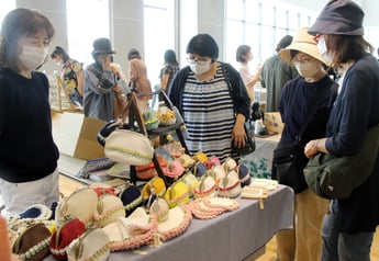 ハンドメード作品の展示販売や音楽の生演奏を楽しむ「オールドリヴァーマルシェ」(実行委員会主催)が19日、大崎市地域交流センター・あすもで開かれた。キッチンカーやプロレス、フリーマーケット、地元店舗を周遊し景品と交換できるスタンプラリーも同時開催され、訪れた人たちは週末のひとときを満喫していた。地元の魅力をアピールする催しで、今回が8回目。会場には手間暇かけて作ったアクセサリーや手芸品、フラワーアレンジメントが並べられ、小物作りを体験できるコーナーも開設。小中学生が買いやすい価格設定の商品もあり、作家との会話や品定めを楽しむ人の姿が多く見られた。