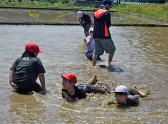 児童たちが水の張った田んぼに入って土をならすユニークな取り組み「人間代かき」が23日、大崎市田尻地域で行われた。挑戦したのは大貫小の5年生15人。学校近くにある学習田を走り回るなど、泥んこになって土壌を整えた。同校の5年生は、4月の種まきからほぼ1年を通して米作りを学んでおり、ことしで19年目。人間代かきもその一環で、大貫地区を拠点に活動するNPO法人田んぼと学習田を提供している農業、●橋秀孝さんの協力を得て実施した。児童たちは衣服の下に水着を着こみ、広さ8アールの田んぼにはだしで入ると、走ったり泥を掛け合ったりして奮闘。中には、泥しぶきを上げながらスライディングする姿も見られた。〝代かき〟した田んぼには土の中にあった雑草などが浮かび上がり、児童たちは丁寧に集めて取り除いた。