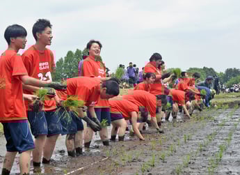 色麻町にある加美農業高の恒例行事「全校田植え大会」が24日、同校実習農場で開かれた。青空の下、生徒140人が協力して手植えをし、正確さや美しさを競った。田植え大会は、農作業が機械化される以前、生徒総出で田植えに励んだ名残といわれる伝統行事。クラス対抗戦で、苗を植え付ける美しさや協力態勢などをポイントに審査される。田んぼは6枚で、合わせて約30アール。そろいのTシャツを着て、はだしで水田に入った生徒たちは合図とともに競技開始。声を掛け合いながら、ひとめぼれの苗を手際よく植えていった。