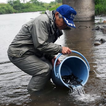 7月1日のアユ釣り解禁に向けて28日、加美町でアユの稚魚放流が行われた。鳴瀬吉田川漁業協同組合などが、鳴瀬川に稚魚1万8000匹を放流した。町は毎年、水産資源の保護や環境保全などを目的に同漁協の協力を得て放流事業を実施。ことしは6月にかけて計約3万4000匹を放流する。稚魚は、同町の「宮城鮎工房」が育成。昨年9月にふ化し、体長10㌢、重さ10㌘ほどに育った。この日は町内4カ所で放流。あいにくの雨模様で、5年ぶりに予定した園児による放流は中止したが、組合員たちは水槽からホースやバケツリレーで稚魚を川に放った。同漁協は7月まで、町の稚魚を含めて計12万5000匹を鳴瀬川や吉田川に放流する予定という。