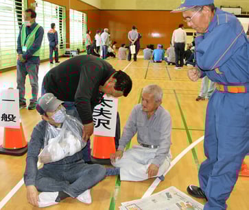 大雨を想定した大崎市松山地域の総合防災訓練が8日、松山B&G海洋センターなどを会場に行われた。避難所での受け入れなどを確認したほか、参加した市民は負傷者の応急手当ても学んだ。訓練は、激しい雨により鳴瀬川の越水が差し迫り、「避難指示」が発令された、という想定で実施。広岡や山王など10行政区の住民、自主防災組織や消防団など約150人が参加した。市松山総合支所は現地警戒本部を設置。防災行政無線で警戒レベル4「避難指示」発令を住民に知らせた。発令を受け、市民は同センターに避難。入り口では市職員らが避難者の氏名を確認し、負傷者や被害状況の報告を受けた。また、避難訓練に参加した住民は大崎広域消防本部の職員から、毛布を担架にして負傷した住民を運ぶ方法や、骨折した脚や手に新聞紙や雑誌を巻きテープなどで固定したり、ビニール袋を利用してけがをした腕をつる手法について指導を受けた。