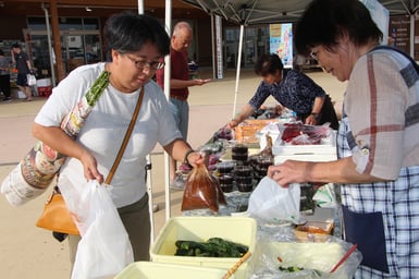 「古川日曜朝市」(古川八百屋市運営委員会主催)が7日、大崎市古川千手寺町の「道の駅おおさき」で始まり、旬の野菜や漬物、みそ、海産物などを扱う店が並び、にぎわいを見せていた。「道の駅おおさき」では4~6月、約400年の伝統を誇る「古川八百屋市(やおやまち)」が開かれ、閉幕後、「日曜朝市」に衣替えして12月まで開催される。開催初日は、野菜や花などを販売する12店が出店。知り合いに贈る漬物やしそ巻きを買いに来たという常連客もおり、出店者と会話を弾ませていた。また、海産物を目当てに訪れる人も多く、海水温上昇の影響で水揚げが激減しているホヤなどを買い求めていた。