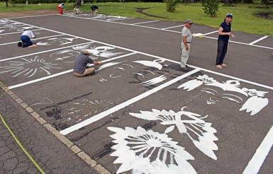 大崎市鳴子温泉の日本こけし館駐車場に5日、鳴子こけしの絵が描かれた。〝絵付け〟したのは地元のこけし工人たち。表情や模様が異なる22点がずらりと並び、訪れた人たちの目を引いている。駐車場のこけし絵は2017年、訪れる人たちに楽しんでもらおうと、当時同館の理事を務めていた工人が4点描いた。しかし、タイヤで削れたり、風雨にさらされたりして徐々に劣化。そこで、白線の引き直しに合わせてこけし絵も描き直すことにした。腕を振るったのは、市地域おこし協力隊を卒業して工人となった田邊香さんを含む11人の工人。1人2カ所を担当し、チョークで当たりを付けた後、白の耐候性ペンキで顔と胴の絵付けに取り掛かった。