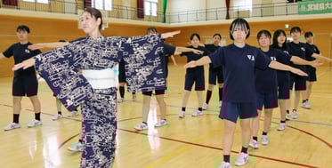 「おおさき古川まつり」(8月3、4日)で「古川おどり」に参加する古川中の生徒が18日、同校で練習を行い、日本舞踊の指導者から手の振りや足の動かし方など教えを受けた。おどりは3日に行われ、まつりを活気づける。古川おどりには企業、福祉団体、大崎市互助会や市議会など11団体、総勢約280人が参加する予定。旧古川市時代から受け継がれている「古川音頭」と、2018年に登場した「大崎ダンス」の2曲に合わせた踊りを披露する。古川中生徒は16年から古川おどりの列に加わっている。ことしは総合的な学習「イベント班」に所属する3年生18人が、おどりのほかに七夕飾りも作って会場に設置し、まつりに参画する。