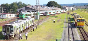 美里町の夏祭りに当たる「えきフェスMISATO」(町主催、大崎タイムスなど後援)が4日、JR小牛田駅東口ロータリーを中心に開かれた。開業135年目を迎えた同駅を中心とする「鉄道のまち」の魅力をPRするのが狙い。列車の展示やダンスコンテストを通して暑い夏を一層熱く盛り上げた。展示された車両は、導入10年目を迎えたJR東日本のディーゼルハイブリッドシステム搭載車「HB−E210系気動車」と、同駅隣の仙台車両センター小牛田派出所(旧小牛田運輸区)に配属されているレール輸送用「キヤE195系気動車」。珍しいそろい踏みとあって鉄道ファンらが写真に収めた。14日には同町牛飼水辺公園で花火大会を開催する。午後6時半から創作和太鼓駒の会(同町)と演歌歌手の渡辺亮子さん(亘理町出身)のショーをそれぞれ行い、同7時半から2000~2400発を打ち上げる。