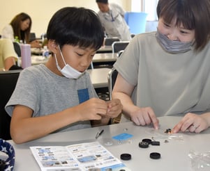 加美町のオイルシール(工業用ゴム製品)メーカー、宮城NOK宮崎工場で7日、町内の親子ら6組15人が工場見学や工作を行い、ものづくりへの関心を高めた。県が取り組む「おおさきファクトリーテーマパーク」の一環。おおさきファクトリーテーマパークは、ものづくりの魅力発信や地元企業の知名度向上、ものづくり産業への将来的な人材確保を目的に、県内の小中学生とその保護者を対象に実施。2021年に8社で始まり、現在は参加企業が17社に増加。参加者も年々増え、ことしは計185組の応募があった。初めて参加した同社は、宮崎工場と登米工場(登米市南方町)で受け入れた。親子らは担当社員から会社概要やオイルシールの説明を受けた後、工場内や作業に打ち込む社員たちの仕事ぶりを見学。児童たちは工場内に漂う独特のにおいについて質問したり、普段見ることのないさまざまな機械を興味津々の様子で眺めたりしていた。