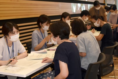 医療や健康づくりに関する気軽な相談の場となっている「フラッといしかいサロン」が7日、大崎市図書館多目的ホールで開かれた。拡大版の今回は市民らが次々と訪れ、心身の健康状態を再確認していた。同サロンは大崎市医師会、市、市図書館が主催し、2018年にスタート。6月から翌年2月まで毎月1回、多くの人が利用する市図書館を会場に血圧測定や健康相談、関連図書を並べる「ミニ図書館」を行っている。このうち9月と2月は拡大版として実施。体組成や骨密度、血管年齢、歯周病などを確認できる専用機器が並ぶほか、健康体操、健康や栄養、薬の相談コーナーも設けている。この日は開始と同時に、職員らの呼び掛けで立ち寄った図書館利用者を含め100人近くが来場。専用機器で健康チェックを受けたり、専門家に相談したりしていた。