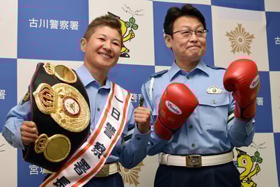 「秋の交通安全県民総ぐるみ運動」が始まった21日、元女子プロボクシング選手の藤岡奈穂子さん(49)=大崎市古川出身=が古川署の一日警察署長を務め、市民らに交通ルール順守を呼び掛けた。日本人初の世界5階級覇者で「おおさき宝大使」も務める〝レジェンド〟に白羽の矢が立った形。署内で高橋誠署長から委嘱状を受け取った後、イオン古川店(古川旭)での交通安全運動啓発イベント会場へ。週末でにぎわう買い物客に拍手で迎えられ、りりしい制服姿でリングならぬステージに上がった。