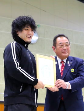 大崎市は17日、ことしデビュー10年目を迎えた同市松山出身のプロレスラーMAO選手(27)=本名・井上麻生=に観光大使「おおさき宝大使」を委嘱した。国内外での興行などを通して大崎のPRに努めてもらうことを期待した。MAO選手はプロレス団体「DDTプロレスリング」(東京都)所属で、2015年にデビュー。同団体王座などのタイトルを獲得し、5月に行われた同団体のシングルマッチトーナメント「キングオブDDTトーナメント」では初優勝を果たした。委嘱状交付は、6年ぶりの凱旋試合会場となった松山B&G海洋センターアリーナで行われた。伊藤康志市長と、地元有志でつくる後援会「松山出身MAO選手を支援する会」(会員13人)の齋藤有司会長が委嘱状と花束を手渡した。
