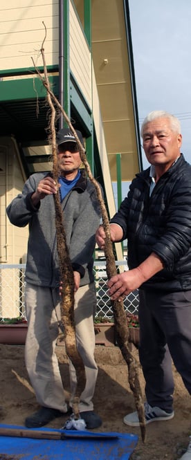 大崎市古川小稲葉町の三浦忠さん(74)と同所で日本料理店「亀乃里」を経営する義弟の亀谷二男さん(66)はこのほど、長さ約1・8㍍の天然自然薯を掘り当てた。自然薯掘りをして60年になるという三浦さんも「これほどの長さは初めて」と驚いている。2人は毎年この時期、自然薯を探しに市内の山へ出掛ける。ことしも10月20日から11月7日にかけて通った。約1・8㍍の自然薯は真っすぐ伸び、最も太い部分は直径約10㌢。重さは約2㌔あり、10~15年ものと推測。三浦さんによると、ゆがんだり分岐したりせず伸びるには土の柔らかさや栄養状態に加え、イノシシに食べ荒らされない運も必要という。