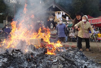 正月飾りや古神札をたき上げて御神火にあたり、1年の無病息災や家内安全などを願う小正月行事「どんと祭」が13日、大崎地方の一部で行われた。裸参りが再開した地域もあり、にぎわいを見せた。実施日を14日夜としているところがほとんどだが、地域によっては15、16日としているところもある。大崎市鹿島台広長の鹿島台神社(岡田英彌宮司)は13日正午から実施。3年前までは14日夜に行っていたが、遠方の臨時駐車場から夜間に徒歩で来社してもらうのは危険を伴うため明るい時間帯に家族連れで訪れてもらおうと、14日に近い休日の日中に移した。祝日のこの日、家族連れが次々訪れた。燃え盛る御神火に正月飾りを投げ入れて暖を取り、家族の平穏や健康を願った。
