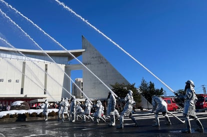大崎市消防団の出初め式は11日、市民会館であり、市内7支団57分団、女性防火クラブの代表者ら約400人がことし1年間の「火の用心」と防災活動に向けて士気を高めた。新春の恒例行事で、団員たちは伝統の法被姿で参加。伊藤康志市長は「仕事に従事しながらも、市民の生命と財産を災害から守るため昼夜問わず献身的に活躍いただいている。崇高な精神、強い責任感に対し深く敬意と感謝を申し上げる」と告示し、内田博美団長は訓辞で「消防力強化に努め、市民皆さんから信頼される消防団として精進する心構えだ。団員は引き続き秩序、精神、技術を磨いて尽力を」と力を込めた。引き続き古川支団の出初め式も実施。終了後には駐車場で3分団の消防ポンプ車が一斉放水し、真っ青な空に水のアーチを描いた。