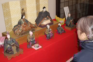桃の節句を前に、岩出山伊達家家臣の中嶋家が所蔵する貴重なひな人形の企画展が、大崎市岩出山の史跡・名勝、旧有備館および庭園で開かれている。優雅な装飾や衣装で来館者の注目を集めている。3月30日まで。展示されているのは、約300年前の「享保びな」。能面のような白い面長の顔に切れ長の目、少し開いた口が特徴で、江戸中期以降に広まった。冠や扇など衣装、道具の一部が失われているが、男びな、女びな、五人ばやしのうち3体、右大臣、左大臣の計7体がほぼ無傷で現存している。衣装も鮮やかな色合いのままで、刺しゅうで緻密に表現された模様も破損していない。