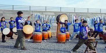 東日本大震災の発生から丸14年を迎えた11日、津波被災地の東松島市大曲浜に200匹余りのこいのぼりが掲げられた。犠牲になった子どもたちに向けて寄付を呼び掛けたところ、全国から寄せられた232匹で、美里町の有志がつないだ縁。同町の創作和太鼓「駒の会」など2団体、約30人が鎮魂の祈りをばちに込めて演奏した。演奏者の中には、地元出身の伊藤健人さん(31)=同市職員=の姿もあった。伊藤さんは一家7人のうち母と弟、祖父母を津波で一度に失った。がれきの中から家族を捜すうち見つかったのが青いこいのぼり。13歳下の弟、律君(享年5)のお気に入りの子ゴイだった。こうした経緯を知った美里町の邦楽制作会社「3D-ファクトリー」がプロジェクトを立ち上げて全国にこいのぼりの提供を呼び掛け、2012年から現地に掲げている。その後、同社元役員の千葉秀さん(59)=同町=が引き継いだ。