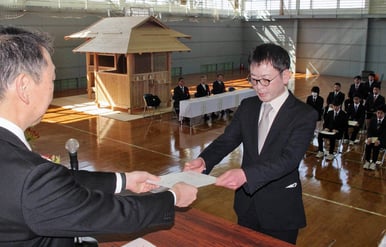 県立大崎高等技術専門校(大崎市古川米倉)の修了式が12日、同校であり、電気および木造建築の技能者となる職業訓練を受けた14人が修了証書を受け取った。同校は電気科(訓練期間1年)、木の家づくり科(同2年)の2科を置き、電気工事士、建築大工として就職、転職を希望する人へ技術指導を行っている。2階建ての現代建築に電気配線を施す模擬家屋など、現場を想定した実習が多いのも特徴。本年度の修了生は電気科9人、木の家づくり科5人。式では横谷光俊校長が一人一人に修了証書を手渡し、技能照査合格証、第二種電気工事士免状といった資格証書や免許状も交付した。