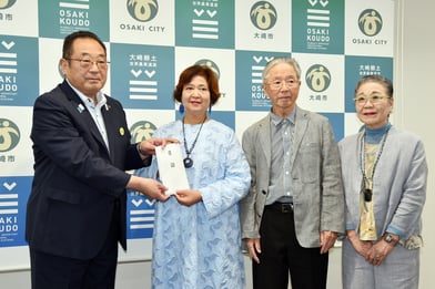 ミャンマー地震発生に伴う被災者支援のため、大崎市は2日、職員有志から募った支援金108万8000円をNPO法人宮城・ミャンマー友好協会(仙台市)へ寄託した。有志中心に募金活動を繰り広げ、市職員と市病院事業職員の計1424人が協力。市役所で贈呈式があり、伊藤康志市長が同国出身で協会理事のスーザ・ミョータンさんに浄財を手渡した。