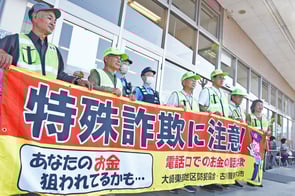 「電話やSNSでお金の話が出たら詐欺」−。高齢者狙いの特殊詐欺に注意を促す街頭啓発活動が年金支給日の13日、大崎地方で相次ぎ行われた。地域ぐるみの呼び掛けで被害を未然防止する構えオレオレ詐欺や投資詐欺など全国で相次ぐ特殊詐欺から高齢者を守ろうと、大崎市田尻地域防犯協会(富田文司会長)はウジエスーパー田尻店で啓発活動を繰り広げた。金曜へ前倒しの年金支給日に合わせて企画し協会、古川署、市田尻総合支所から計11人が参加。店頭に陣取り、買い物客とATM利用者に詐欺の手口が記されたチラシを手渡していったほか、「特殊詐欺に注意!」の横断幕を掲げてPRした。