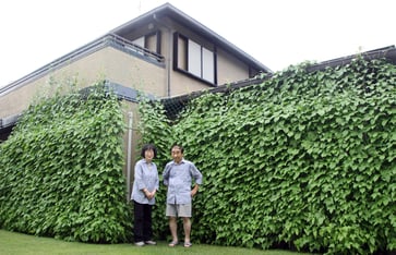 大崎市古川竹ノ内の清野学さん(75)、哲子さん(72)宅で、見事なアサガオのグリーンカーテンができた。鮮やかな緑で覆われた外観はさながら洋館といった感じで、厳しい暑さが続く中、近所や訪ねてくる人たちに一服の涼をもたらしている。グリーンカーテン作りは15年ほど前、哲子さんが職場からアサガオの苗を4本もらってきてから続けている。ことしはゴールデンウイークのころ種をまき、現在は一部が2階ベランダに届くほど成長。それでも、例年はもっと伸びるという。日陰になるカーテンの内側は外気温より数度低く、ひんやりする感じ。「かわいそう」と間引きしなかった影響で密生し、深い森の中にいるような印象を与えている。