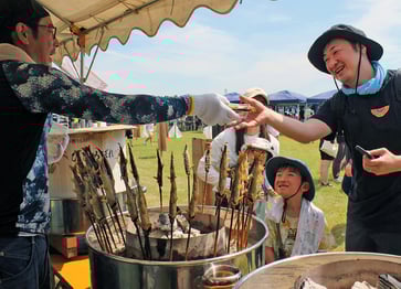 「鮎フェスin鳴瀬川・鮎釣りトーナメント」(実行委員会主催)が20日、加美町の小野田大橋付近で開かれた。アユの塩焼きが振る舞われたほか、子どもたちを対象にしたアユのつかみ取りなども行われ、大勢の親子連れなどでにぎわった。アユは町内で養殖されたもので、塩焼きを振る舞うコーナーの前には長蛇の列。真夏の日差しが照りつけ気温がぐんぐん上昇する中、スタッフが汗を流しながら炭火で焼き上げ、来場者に手渡していた。