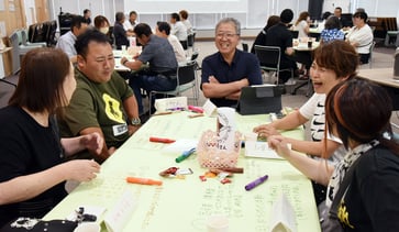 大崎市議会主催「議員と語ろうワールドカフェ」が26日、市役所本庁舎であり、議員と公募の一般市民が「理想のまちづくり」について意見を交わした。議場での「堅い」「まじめ」な姿とはうって変わって、Tシャツにジーパンなどカジュアルな装いで参加者を出迎えた議員たち。班に分かれてホスト役を務め、子育て世代、働き盛りの自営業、孫含め大所帯で暮らすお年寄りなど職業、年齢とも多彩な顔ぶれの市民と意見交換していった。菓子を頬張り、飲み物で喉を潤しながらの語らいはまるで井戸端会議のよう。「子どもが成長して進学、就職後も住み続けたいと思えるまちに」「高齢者や障害がある人も暮らしやすく」といった夢のある自治体像が市民側から次々飛び出した。