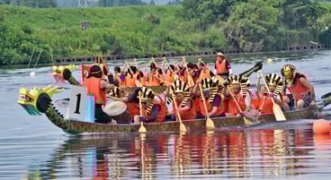 加美町の夏の風物詩「第22回ドラゴンカヌー大会」(同実行委主催、大崎タイムスなど後援)が27日、鳴瀬川カヌーレーシング競技場で開かれた。県内外の37チームが団結力を発揮して熱戦を繰り広げた。ドラゴンカヌーは竜をかたどった艇にこぎ手と太鼓、操舵手の12人が乗り、速さを競う競技。初心者、競技経験者を問わない「一般の部」、4人以上の女子選手を含めた「混合の部」があり、コースは直線250㍍。出場チームは中高の部活仲間、職場の同僚、カヌークラブ、小学校の教職員同士、職種は違うが気があった仲間たちなどさまざま。選手たちは、太鼓の音に合わせて一体となってパドルをこぎ、熱戦を繰り広げていた。