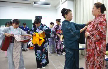 大崎市立おおさき日本語学校の生徒たちが7月29日、浴衣の着付けを同校で体験した。2~4日の「おおさき花火大会」と「おおさき古川まつり」に浴衣姿で出掛けるのを目指し、見よう見まねで練習した。日本の伝統文化に触れてもらおうと、涌谷町字桑木荒で着付け教室を主宰する白岩徳子さん(78)の申し出で実現した。白岩さんのほか生徒ら合わせて9人が、希望する同校の女子生徒10人に指導した。浴衣の羽織り方から帯や腰ひもの結び方、髪飾りの着け方に至るまで講師陣が実演してみせたり、手伝ったりした。無事に着こなした生徒たちは、かわいらしいデザインの浴衣に満足げな笑みを浮かべた。