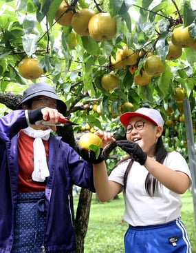 美里町北浦小(佐藤浩人校長、児童数95人)の3年生11人が8日と12日、旬を迎えている「北浦梨」の収穫、販売を体験した。生産の苦労と喜びを学び、地元特産品をPRした。地元生産者の協力で2002年に始めた取り組み。ことしは摘果(6月)から携わった。8日は同町北浦米谷の遠藤とし子さん(74) 方で収穫を体験。高い所に実を付けたナシに手を伸ばし、はさみで芯を切って収穫したほか、1日当たりの収穫量や作業時間について遠藤さんに尋ねた。試食した佐藤陽翔君(9)は「みずみずしくておいしかった。北浦梨を多くの人にも味わってほしい」と語った。 12日は、町内の国道沿い直売所3カ所で販売を体験。児童たちは「あまくておいしい北うらなし」などと手書きしたボードを掲げて「買ってください」と声を張り上げた。来店した人たちからお金を受け取ると、釣り銭とともに「ありがとうございます」とナシを手渡した。