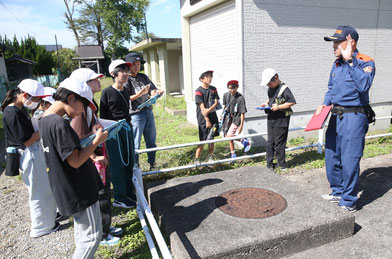 大崎市三本木小(和田淳二校長、児童数270人)の5年生55人が3日と8日、学校周辺を探検し、危険箇所や防災設備を調べた。日本損害保険協会(東京都)が「ぼうさい探検隊」として主催したもので、調べた内容は防災マップにまとめた。地元の「人・もの・こと」を生かした学習を通して効果的な学びにつなげるほか、地域の一員としての自覚を高めてもらう取り組み。自主的に災害への備えや身近な危険について考えてもらい、防災思想啓発と防災リーダー育成につなげる意図もある。児童たちは6班に分かれ、古川消防署三本木出張所(相澤大成出張所長)職員や同会会員、保護者とともに約2時間かけて学校の周辺を探検。沿道の消火栓や防火水槽、防災倉庫をタブレットで撮影したり、過去の地震や水害の被害、災害対策について店主の話をノートに書き留めたりした。探検で発見した設備や気付いた事柄はまとめ、タブレットを使ってデジタル防災マップに反映。校内で発表し、5年生全員で共有した。