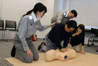 耳の不自由な人の生活を支援する「みみサポサロン」が10日、大崎市古川の大崎広域行政事務組合庁舎で開かれ、参加者たちが心肺蘇生法などを学んだ。「みみサポサロン」は、県聴覚障害者情報センターが、自治体などとともに耳の不自由な人が生活に必要な情報の提供、交流事業を県内各地で行っている。心肺蘇生法の体験は緊急時の対応力を身に付けようと開催され、大崎地方から15人が参加。大崎広域消防本部職員の指導で、人形を使った心臓マッサージなどを体験した。職員が話す内容は、スクリーンに投影される文字と手話通訳を通して参加者が把握。倒れた人を発見したときの対応としては、まず意識があるか大きな声を掛けて確認。同時に周囲の人へ119番通報や自動体外式除細動器(AED)を持ってくるよう求める。さらに胸の真ん中を、両手を重ねて成人では5㌢ほど押すことなどを学んだ。