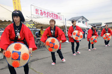大崎市古川宮沢地区の「宮沢祭りだよ! 全員集合!」(宮沢地域振興協議会主催)が19日、同地区公民館で開かれた。20年来の交流がある山形県尾花沢市の物産が数多く並んだほか、花笠踊りの披露もあり、大いに盛り上がった。かつて1年おきに開いていた二つの祭りを統合した古川宮沢地区最大のイベント。尾花沢市宮沢地区との交流は昨年20周年を迎え、花笠踊りグループも発足。8月には「おばなざわ花笠まつり」に参加し、総勢1000人を超える大パレードで演舞してきた。この日、オープニングを飾ったのは花笠踊り。古川宮沢と尾花沢市宮沢の踊り手が共演し、華やかに幕を開けた。山形県ブースには、同県産しょうゆで味を調えた芋煮汁を求める長い行列ができた。地酒、祝いの席に出されるコイの甘露煮、そばなども販売された。