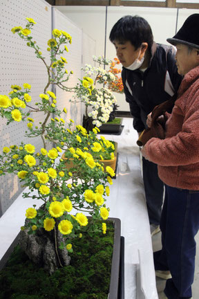 大崎菊盆栽愛好会(藤田多喜男会長)の展示会が3日から、大崎市民ギャラリー・緒絶の館で開かれている。会員14人が大切に育ててきた50鉢が会場を彩り、訪れる人たちを楽しませている。5日まで。菊盆栽は岩や流木に小菊の根を絡ませ、新芽を生かして毎年一から形を作る。3月の土作りから始まり、新芽が成長したら針金で形を整える。型の基本に会員それぞれ個性を加え、唯一無二の作品を仕上げている。幹や根を寒さから守るため、冬囲いも大切な作業だという。