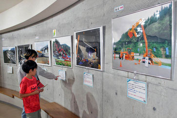 「工事のみりょく写真展」(東北建設マネジメント技術協会、東北地方整備局主催)が、大崎市岩出山池月のあ・ら・伊達な道の駅スパイラルホールで開かれており、訪れた子どもたちに建設業の魅力を伝えている。9日まで。建設産業界のイメージアップを図り、将来の担い手確保につなげようと、毎年この時期に開催。同協会加盟企業が東北6県で行ったダム、トンネル、橋梁建設工事の模様をはじめ、建設機械、働く車などの写真74点を展示。解説付きで紹介しており、鳴子ダムのすだれ放流、国道47号中山平大橋上部工工事もある。