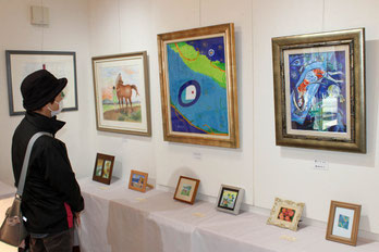 大崎市古川駅東の絵画教室「アトリエ竹本」(竹本恵子代表)のグループ展七宝展が、同市古川穂波2丁目のギャラリー&カフェびいひろで開かれており、水彩画や油彩画、七宝を取り入れた作品などが来場者の目を引いている。9日まで。会場には竹本さんと生徒の力作57点を展示。このうち鎌倉亜紀子さんの「ねこ」は、香箱座りでくつろぐ愛猫を描いた油彩画。細かく描画した黒、茶、白のしま模様は毛並みの質感を感じさせるほどで、訪れた人たちは熱心に見入っていた。