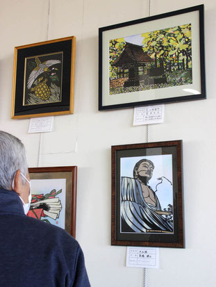 宮城いきいき学園登米・栗原校卒業生有志による「切り絵の会」の作品展が6日から、栗原市築館総合支所2階の市民活動支援センターで開かれている。カラーとモノクロ合わせて26点が披露されており、来場者の目を引いている。20日まで。同会は、40年ほど前に独学で切り絵を始めた菅原大治さん(80)が学園の文化祭に出品したところ、興味を示す仲間が集まり活動が始まった。会員が集まっての活動は2、3カ月に1度で、普段は各家庭で制作に励んでいる。菅原さんの創作活動は、作品にしたい題材の写真を撮ることから始まる。定規を使わずに黒い紙を切り、裏側から和紙を貼って色を入れる。今回は現役時代に5年ほど勤務した栗原市花山の名所、仙台藩花山村寒湯番所跡の風景など5点を出品。ほかのメンバーも、著名な切り絵作家の作品を参考にするなどしてイメージを形にした。