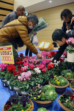 南郷高の生徒が育てた農産物販売会が8日、大崎市図書館で開かれた。心待ちにしていた市民で開始前から長蛇の列ができ、搬入されたシクラメンの花鉢、ダイコンやネギが飛ぶように売れ、生徒たちは忙しいながらも笑顔を絶やさず接客していた。同館が大崎地域の高校12校と締結している連携事業の一環。各校の図書委員が順番でお薦め本や学校の特色を紹介する展示コーナーがあり、今月は同校が担当。今シーズンは暑さの影響はあったものの、シクラメン130鉢をはじめダイコン、ネギも前回より品数を増やし、高品質のものを取りそろえたという。
