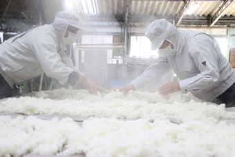 大崎市松山の酒造会社「一ノ蔵」が栗原市一迫川口に設ける第2蔵、金龍蔵で14日、例年より1カ月ほど早く今シーズンの酒造りがスタートした。初日は朝からコメを蒸して麹を作る作業が始まり、夕方には関係者が出席し、酒造りの開始を告げる甑起こしの神事が執り行われた。甑はコメの蒸し器のことで、蔵人たちは大きな甑で蒸したササニシキと蔵の華を布に載せ、麹室へ走って移動。麹室では平らに広げたコメに麹菌を振り、布で何重にも包み発酵を促した。麹菌はわずかな空気の揺れにも影響を受けるため、室温約30度の中、慎重に手を動かしていた。