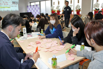 大崎市と宮城誠真短大は13日、「10年後の大崎市らしい豊かな子育て」を考えるタウンミーティングを同短大で行った。市職員と学生約40人が参加し、人口減少社会の中でも充実した子育てができるアイデアを出し合った。タウンミーティングは、市と同短大が3月に結んだ包括連携協定に基づく初の取り組み。参加者は4~5人ずつ班を組んでワークショップを行い、市が持つ魅力や豊かさを思いつく限り発表。「豊かな自然の中で子育てできる」「都会へのアクセスが良い」などの意見があった。さらに、それらを未来へ残していく方法について意見交換。保育者を目指す学生からは「保育者と保護者の関係を友達のように近くする」「子育てに困っている人を支え合う環境づくり」といった声が聞かれた。