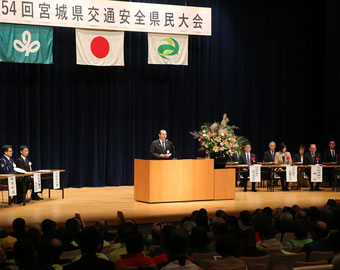 県民総ぐるみによる交通安全運動推進を宣言し、交通安全意識の普及高揚を図る「第54回県交通安全県民大会」(県、県警、美里町主催)が18日、同町文化会館で開かれた。県内一円から集まった約600人が、交通事故防止へ協力して取り組むことを誓った。冒頭、交通事故で亡くなった人の冥福を祈り黙とう。伊藤哲也副知事と杉本伸正県警本部長、相澤清一町長が「交通死亡事故は減少傾向が続いているが、飲酒運転や高齢者が犠牲になる事故は依然後を絶たない。年末に向け事故の多発が懸念され、関係機関、団体が連携し対策を進めたい」などとあいさつした。