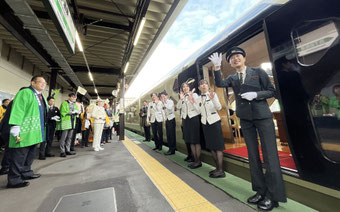 豪華寝台列車「トランスイート四季島」の本年度最終見送りセレモニーが20日朝、JR鳴子温泉駅(大崎市鳴子温泉)であり、地元関係者らが上野駅(東京都台東区)へ旅立つ列車を送り出した。セレモニーは市と観光団体などでつくる実行委員会の主催。「四季島」が陸羽東線乗り入れで同駅に立ち寄るたび、ブランド米「ささ結(むすび)」のおにぎりを振る舞ったり、入浴剤を配布したりと、心身温まるサービスを乗客へ提供してきた。国内だけにとどまらず、海外でも高い知名度を持つ寝台列車は観光誘客の〝希望の星〟的存在だ。市観光交流課によると、今回の乗客30人のうち4人がインバウンド(訪日外国人客)。実行委の伊藤康志会長(大崎市長)はあいさつで「地域を挙げたおもてなし」の継続を呼び掛け、リピーター増に期待した。