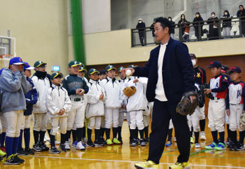 元プロ野球・東北楽天ゴールデンイーグルス選手、銀次さんの「トークショー&野球教室」が24日、大崎市三本木総合体育館で開かれた。市内の少年野球5チームが指導を受け、基本技術を学んだ。同市体育協会三本木支部(三浦幸治支部長)が主催。参加したのは地元の三本木ファイターズをはじめ、古川ドジャース、古川スワローズ、古川あすなろヤンキース、鹿島台ロイヤルファイターズの総勢約60人。野球教室で銀次さんは「走る」「投げる」「捕る」「打つ」の基本技術を指導。ベースの踏み方やゴロ捕球時の体勢、バットを下から上にすくい上げるように振るアッパースイングなどを細やかに説明したり、自ら手本を見せたりして分かりやすく指南した。児童たちは、銀次さんのアドバイスを聞きながら捕球やスイングを実践。フォームなどがつくられてくると、「その調子」と銀次さん。熱血指導に応えるように、児童たちは熱心に取り組んでいた。