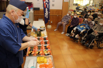 大崎市社会福祉協議会が運営する古川西部デイサービスセンター(佐々木裕子管理者)で19、20の両日、計約60人の利用者ににぎりたてのすしが振る舞われた。同施設で年に1度開かれている恒例行事。年間行事の中でも利用者が特に心待ちにしている催しといい、この日に合わせ、利用日をずらして参加する人も多いという。お品書きはマグロ、サーモン、蒸しエビ、ネギトロ、玉子、いなりずし、太巻きずしに茶わん蒸し、おひたし、すまし汁が付いた豪華版すし御膳。かみ切りやすいのりを使い、シャリを小さくするなど食べやすさを〝隠し味〟に、日清医療食品仙台支店のインストラクター武山祐一さんが腕を振るった。目の前で繰り広げられるデモンストレーションに、利用者は興味津々。武山さんも「きょうのサーモンは脂がのって最高」「玉子は焼きたてだよ」と場を盛り上げた。きれいに平らげた男性利用者は「若いころはすし屋で一杯やったこともある。懐かしい」と笑顔を見せた。