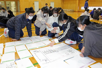 大崎市古川南中(生徒数438人)は21日、全校で「総合防災体験学習」を行った。災害時に役立つ知識や行動、心構えを身に付けるもので、河川が多く水害に見舞われがちな学区がある同校ならではの取り組み。このうち3年生129人は、学校を舞台とした避難所運営をカードゲームで疑似体験した。3年生は4~6人のグループに分かれ、避難者一人一人に見立てたカードを、持病や感染症の有無、ペット連れといった事情に配慮しながら、体育館や教室に次々と受け入れた。ゲーム中は「体調不良者が出た」など避難所ならではの不測の事態も発生し、その都度話し合いながら対応を決めた。