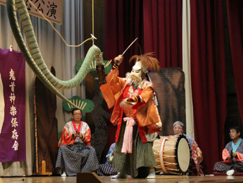 ことし発足100周年を迎えた大崎市鳴子温泉の鬼首神楽保存会(後藤錦信会長)は11月30日、オニコウベリフレッシュセンターで記念公演を行った。会員10人は約40年ぶりに披露する「大蛇退治」など3演目を熱演し、約120人の観客を沸かせた。鬼首神楽は、南部神楽にルーツを持つとされる鳴子温泉鬼首地区の伝統芸能。江戸時代後期ごろから踊り継がれ、式舞、劇舞など20以上の演目をお囃子に乗せ、歌とせりふ、踊りで表現する。2016年に市の無形民俗文化財に指定された。同保存会は、明治、大正期に一時衰退した神楽を再興させようと、1925(大正14)年に地域住民たちで発足。「型を変えない」という強いしきたりの下で100年間、地域の伝統を守り伝えてきた。こうした長年の功績が認められ、ことし11月には県教育委員会から文化財保護功労者表彰を受けた。この日披露したのは「鶏舞」「岩戸入り」「大蛇退治」で、このうち大蛇退治は演者不足などで約40年間お蔵入りとなっていた演目。中学生から79歳までの会員が約5カ月の練習成果を発揮し、いけにえとなって嘆く奇稲田姫や、のたうつ大蛇、大蛇と闘う素戔嗚尊などを熱演。観客から大きな拍手が送られた。