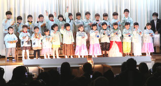 園児数減に伴い来年3月で閉園する涌谷町の3幼稚園(涌谷、涌谷南、ののだけ)で11月22、29の両日、園児による発表会がそれぞれ開かれた。子どもたちが最後の発表に向けて練習した成果を披露した。涌谷幼稚園(佐々木隆子園長)では、全園児26人が赤ずきんと孫悟空を発表した。年少児は2人だけのため、年中児11人とともに赤ずきんを上演。それぞれ練習成果を生かし、自分たちの役を精いっぱい演じた。最後の開催にちなみ、合奏と斉唱をプログラムに加え、園児たちがピアノ伴奏に合わせタンバリンやカスタネットを鳴らしたのに続き、園歌を歌い上げた。カメラを構えた保護者たちは、同園のステージで輝く子どもたちの姿を記録と記憶に焼き付けていた。