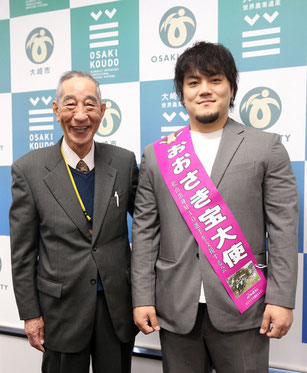 ことしデビュー10周年を迎えた大崎市松山出身のプロレスラーで、おおさき宝大使を務めるMAO選手(28)を応援しようと、地元有志がたすきを自作した。4日に本人へ贈り、一層の活躍を期待した。MAO選手は2015年にデビュー。昨年、当時最年少の宝大使に任命され、国内外での試合やテレビ出演の際、大崎市のPRに努めている。たすきは、松山御本丸公園のコスモスをほうふつさせるピンク色の下地に「おおさき宝大使」と大きく記し、上に市の公式キャラクター「パタ崎さん」、下に松山ゆかりの人車の画像が添えられている。昨年設立した「松山出身MAO選手を支援する会」が、製作を決めてから10日間ほどで完成させた。